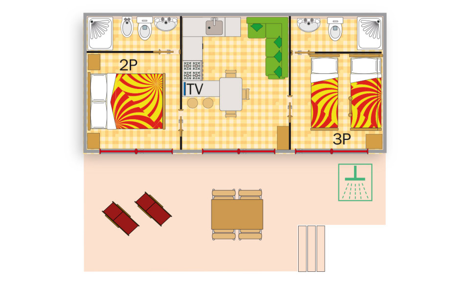 . Zwei Badezimmer mit Dusche, Waschbecken und WC